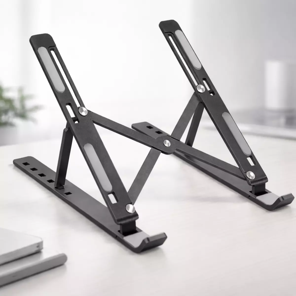 Adjustable laptop stand designed for ergonomic desk setups and portable use.