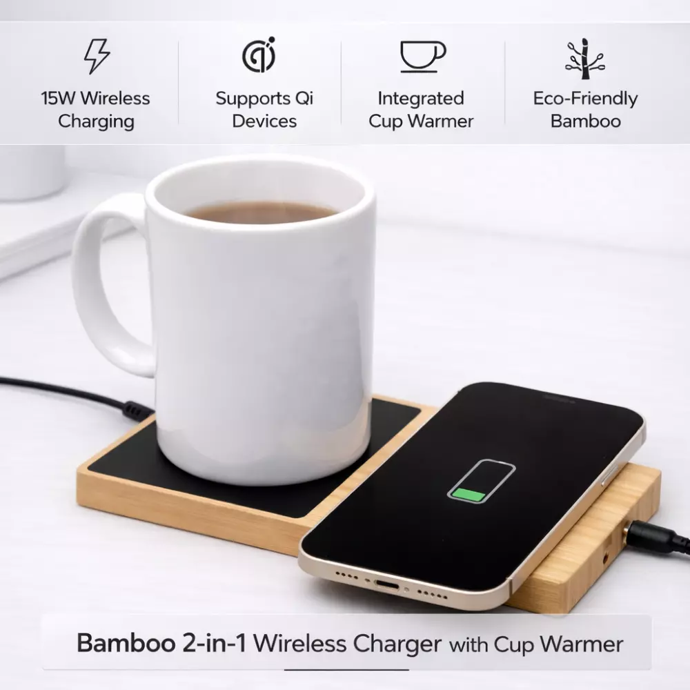 With dual-purpose functionality, eco-conscious material selection, and branding compatibility, Bamboo 2-in-1 Wireless Charger with Cup Warmer serves as a practical addition to structured corporate gifting programs.
