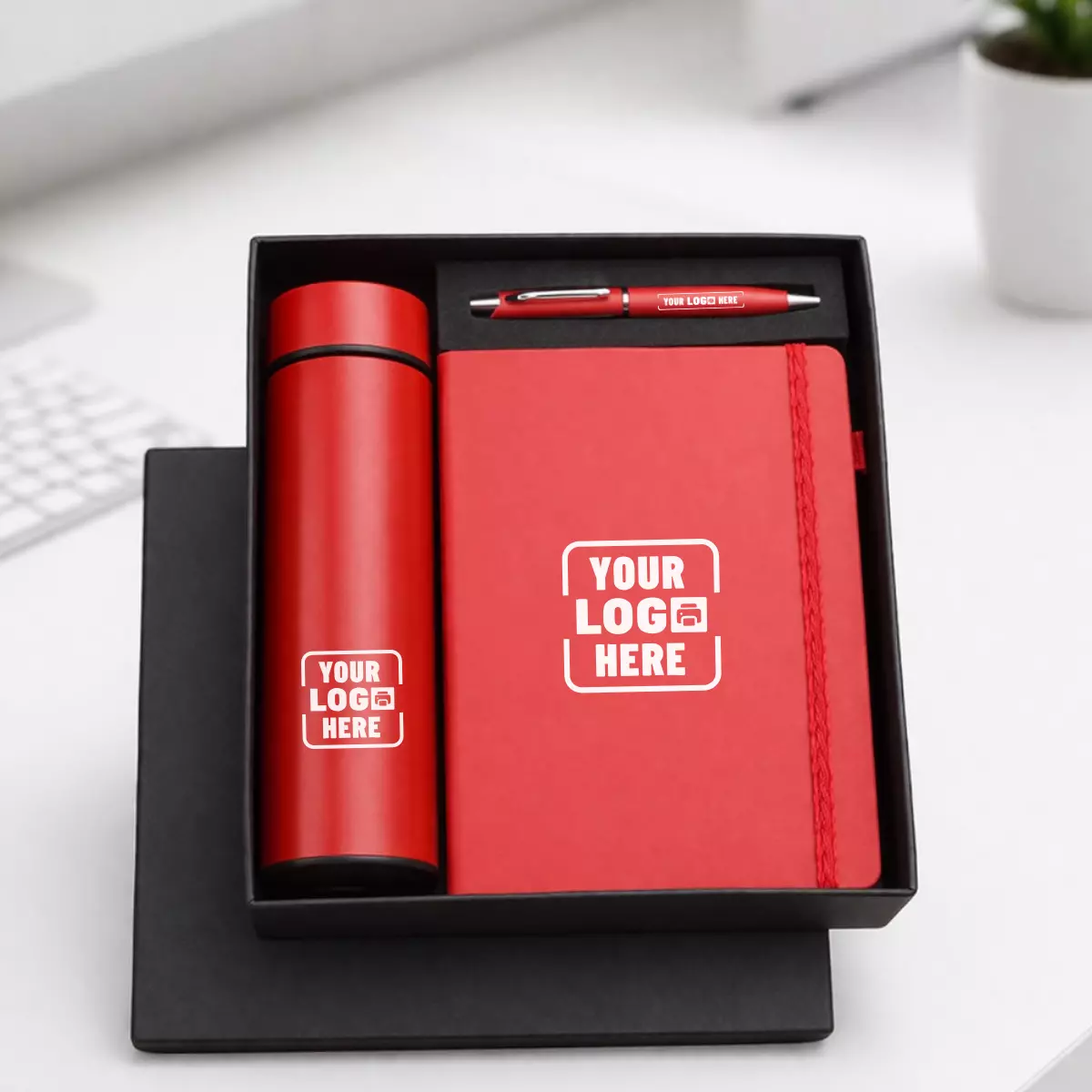 A coordinated red corporate gift set with diary, bottle, and pen.