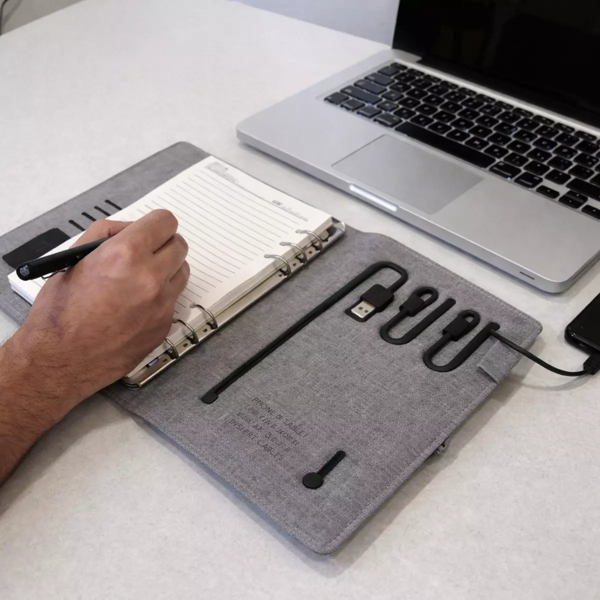 The integrated 5000mAh battery capacity provides backup charging support for smartphones and compatible devices, helping professionals stay connected throughout extended work hours. Whether during conferences, sales visits, internal meetings, or business travel, the built-in power bank offers convenient access to emergency charging without requiring a separate device.