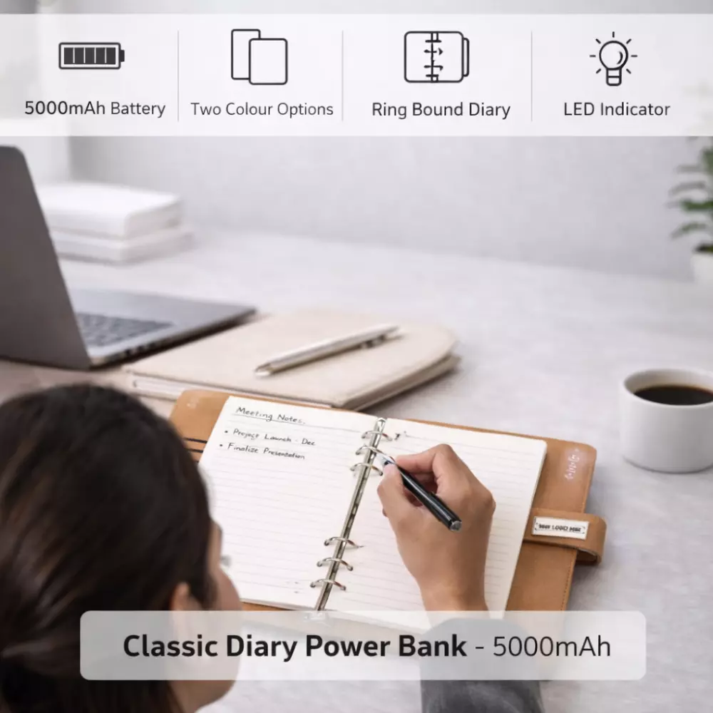 By integrating diary functionality with portable charging support, Classic Diary Power Bank – 5000mAh aligns with workplace efficiency requirements while maintaining a clean and professional corporate gifting profile.