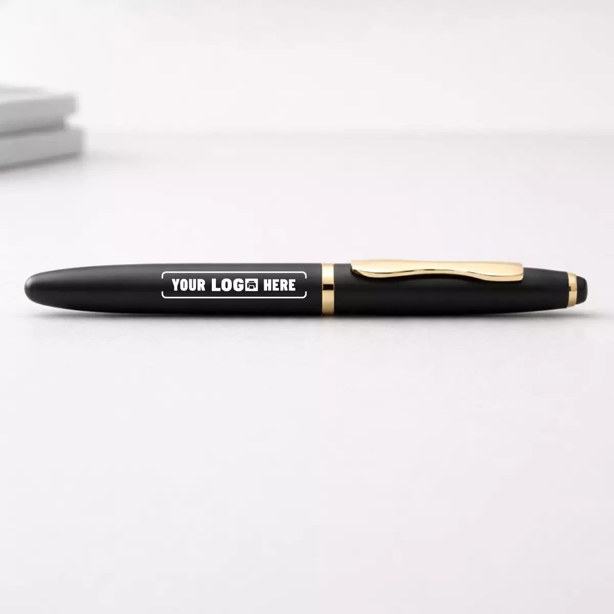This pen features a simple, understated design that fits comfortably into professional environments. The matte black finish provides a clean, non-reflective surface, while the gold trim adds a subtle highlight without appearing overly decorative. The overall look remains neutral and versatile, making it suitable for a wide range of industries and branding styles.