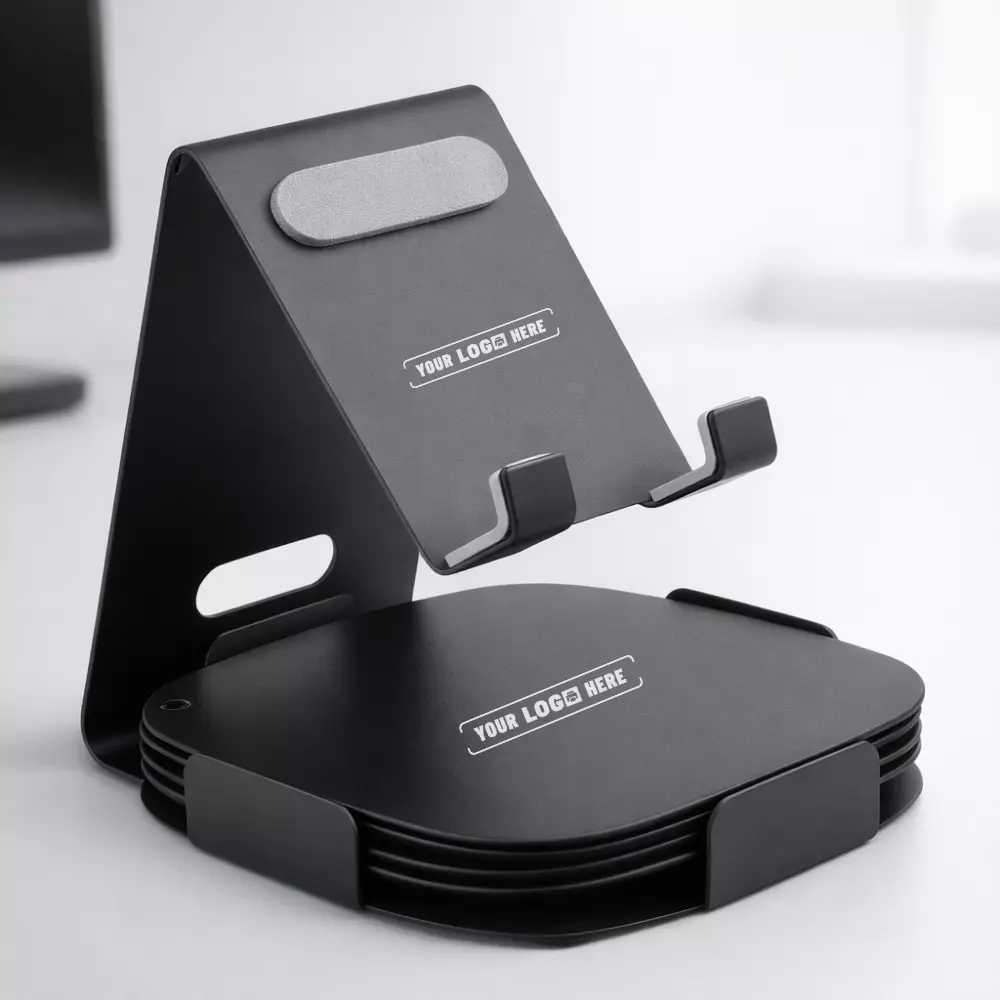 A practical desktop utility set combining a metal mobile stand with four branded coasters for everyday office use.