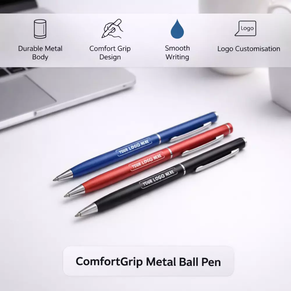 Branded metal pens are commonly used in onboarding kits, corporate events, seminars, and client meetings. The ComfortGrip Metal Ball Pen fits seamlessly into these use cases due to its professional look and practical value.