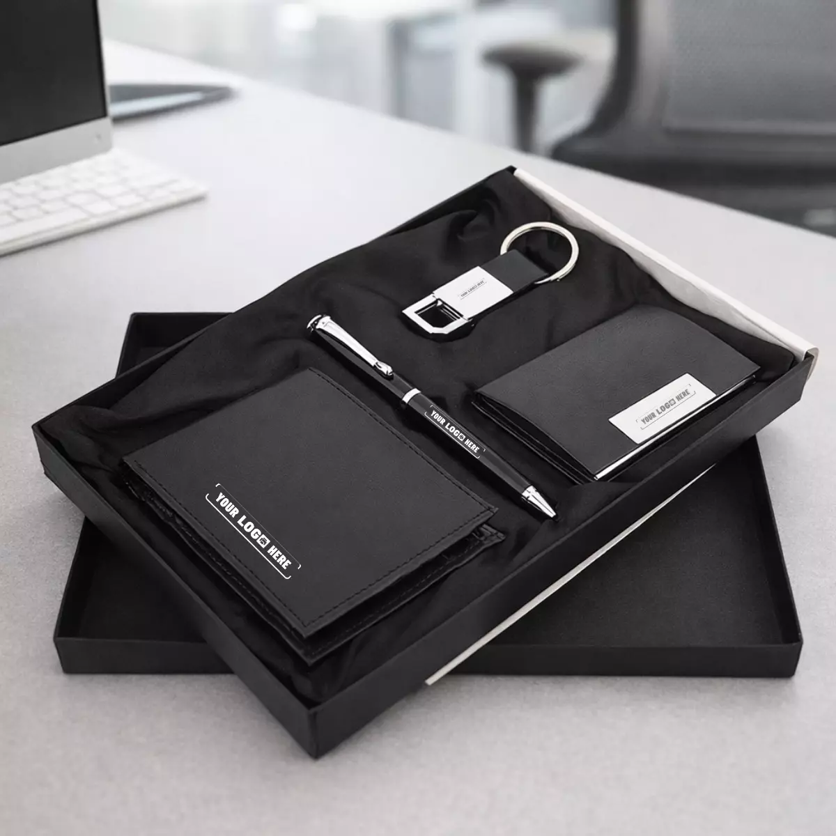 • 4-in-1 corporate gift set including pen, wallet, card holder, and keychain