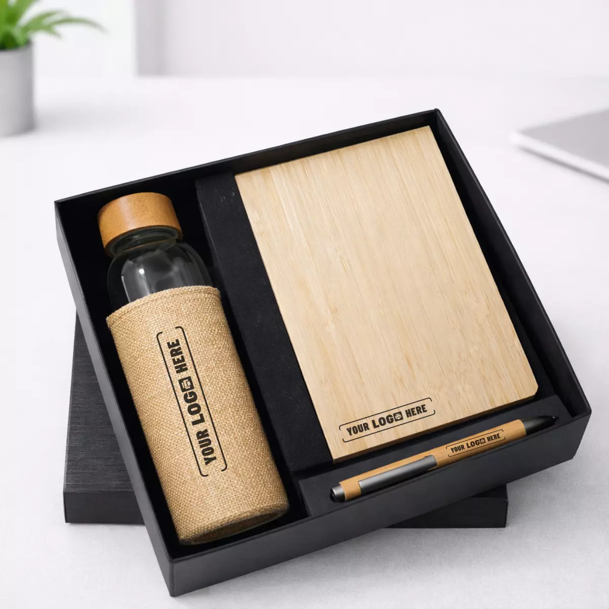 This set is suitable for organisations that prefer gifting products made from natural finish materials such as wood and jute, combined with reusable glass drinkware. The combination of a diary, pen, and bottle makes this set suitable for employee welcome kits, conference kits, training programs, and corporate gifting programs.