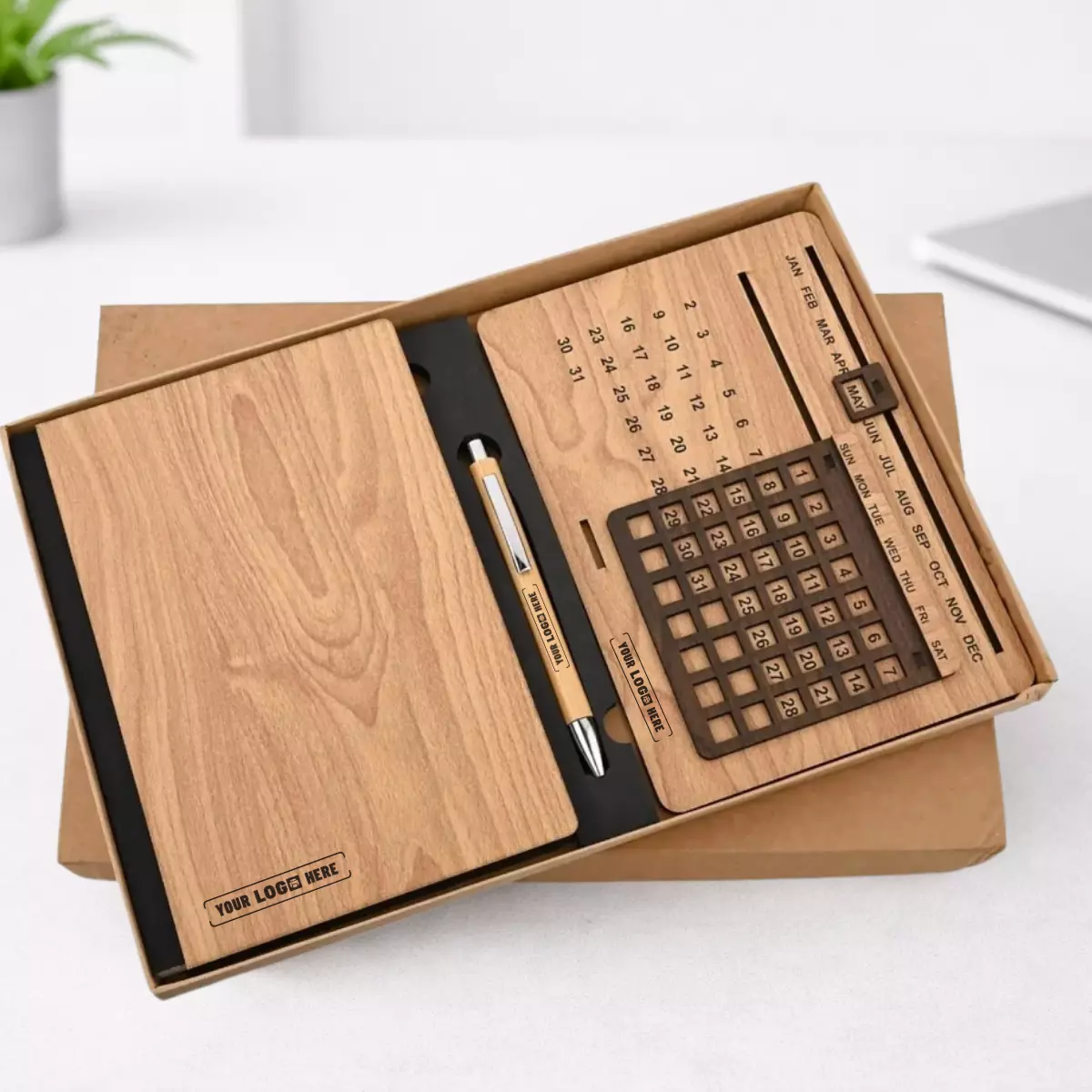This set is suitable for companies looking for corporate gifts that are not disposable and remain on the recipient’s desk for a long time. Since the wooden lifetime calendar is a permanent desk accessory, it helps in maintaining long-term brand visibility when the company logo is printed or engraved on the calendar or diary.