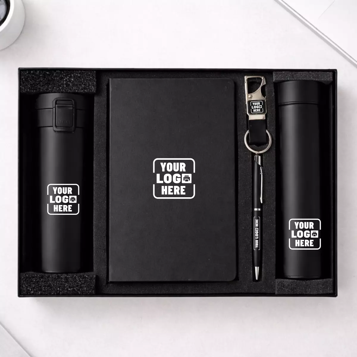 Elite 5 in 1 Gift Set is a comprehensive corporate gifting solution designed for organisations looking to provide a combination of office essentials and daily-use products in one premium presentation box. This set includes a hardbound diary, a metal pen, a metal keychain, an insulated sensor temperature bottle, and an insulated flask, all arranged in a black compartment gift box. The coordinated black finish across all items gives the set a uniform and professional appearance, making it suitable for employee onboarding kits, executive gifting, client gifting, and corporate events.