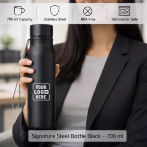 The minimal design and neutral colour options ensure the branding remains visible without overwhelming the overall product aesthetics. This balance makes the bottle suitable for both internal employee gifting and external client engagement.