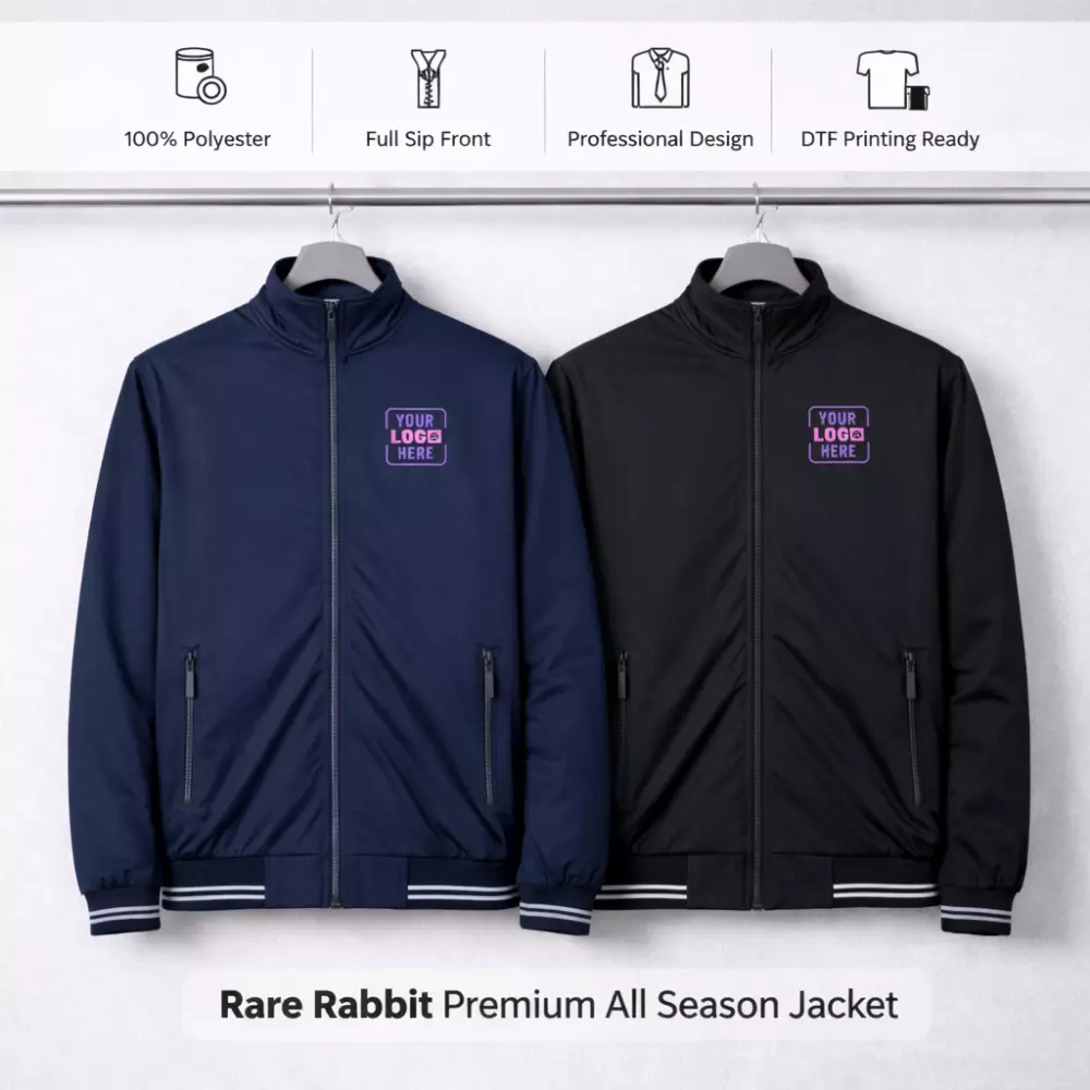 The Rare Rabbit Premium All Season Jacket supports corporate branding through modern printing methods such as DTF printing. This allows organisations to apply company logos, team identifiers, or campaign visuals with clarity and consistency. DTF printing is particularly suitable for polyester surfaces, ensuring clean logo reproduction without affecting the jacket’s lightweight structure.