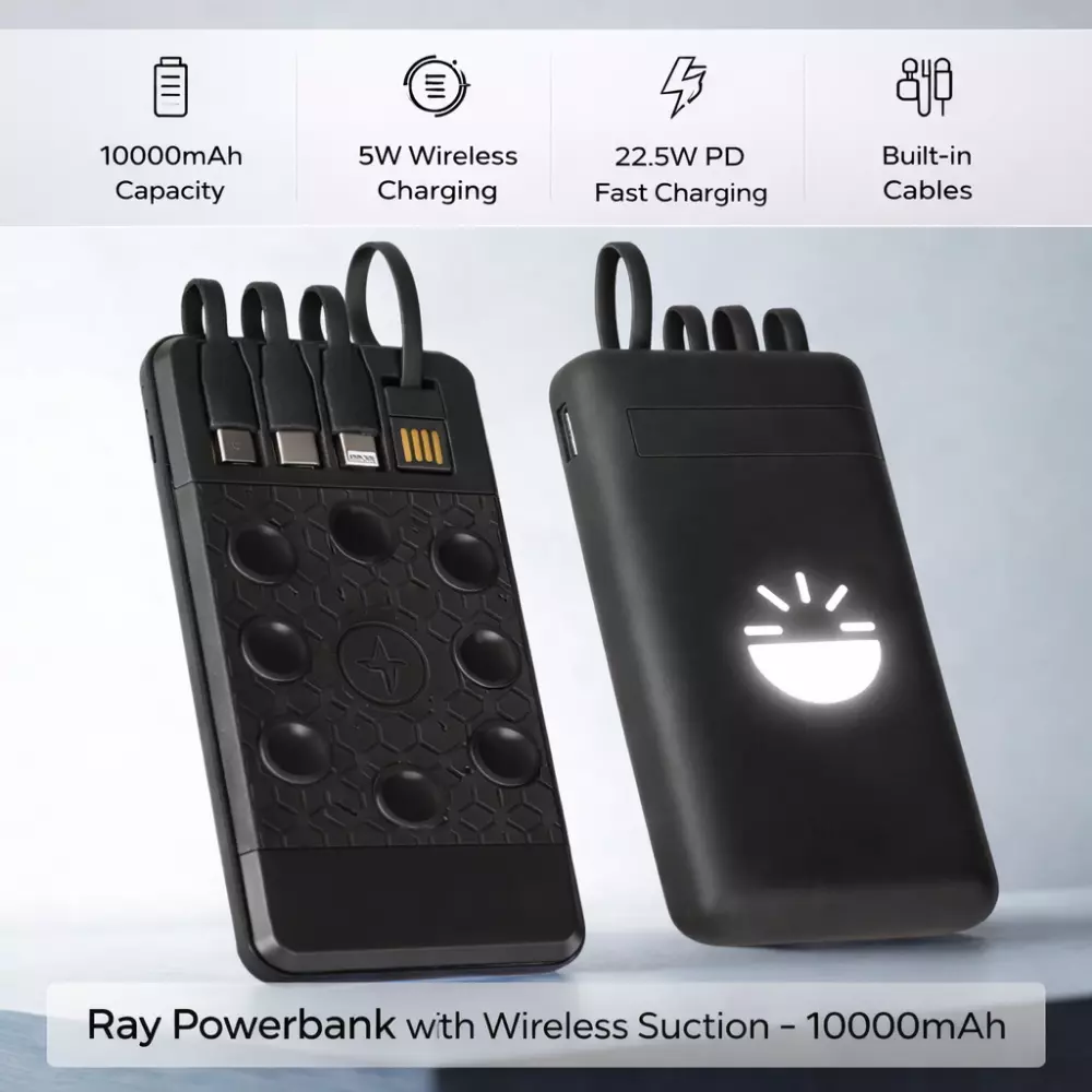 Ray Powerbank with Wireless Suction-10000mah features an integrated suction cup design that securely attaches to compatible smartphones, ensuring stable wireless charging without the need for additional support. The built-in wireless functionality supports Qi-enabled devices, while the high-speed 22.5W PD output allows efficient cable charging for compatible smartphones and gadgets. This dual charging flexibility makes it suitable for diverse corporate device ecosystems.
