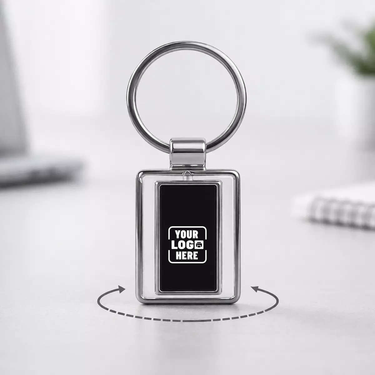 The Rectangle Rotating Key Chain comes with a durable outer metal frame and a rotating inner plate that can be branded on both sides. The rotating mechanism moves smoothly within the frame, making the key chain visually interactive while also increasing branding visibility. The rectangular shape provides a clean and structured branding surface suitable for company logos, employee names, event branding, or campaign messaging. The outer ring is made with a sturdy metal loop that securely holds multiple keys, making it suitable for everyday use. This product is commonly used in corporate gifting due to its utility, compact size, and professional appearance.