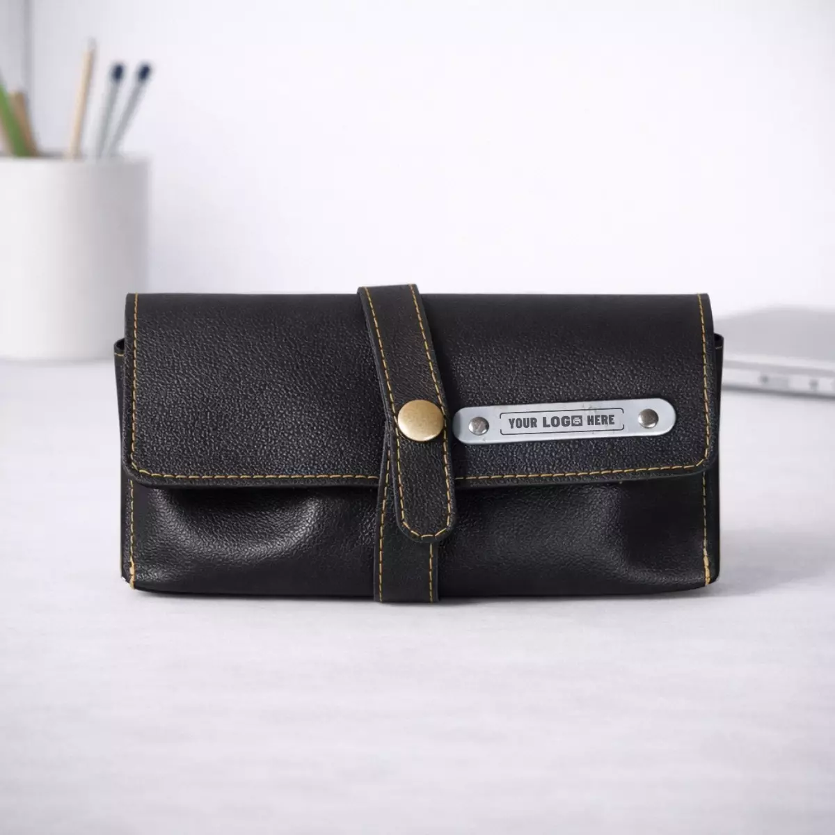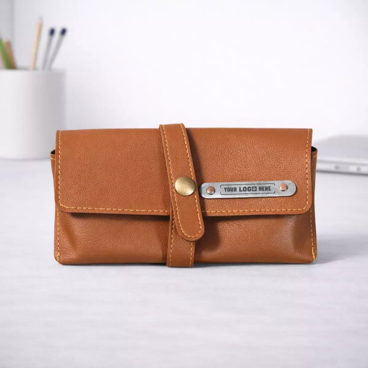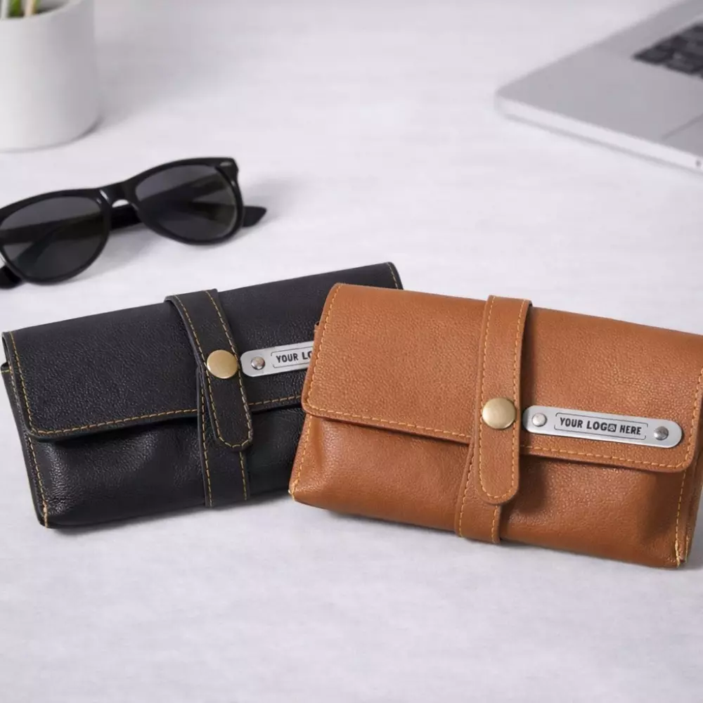 Signature Leather Sunglass Case is available in Tan Brown and Black colour options, allowing organisations to select a finish that complements their brand identity or gifting theme. The exterior includes a dedicated metal plate suitable for laser marking, enabling subtle and professional logo placement. Its compact fold-over structure with secure snap-button closure ensures the eyewear remains protected while maintaining a sleek profile suitable for carrying inside laptop bags, backpacks, handbags, or travel organisers.