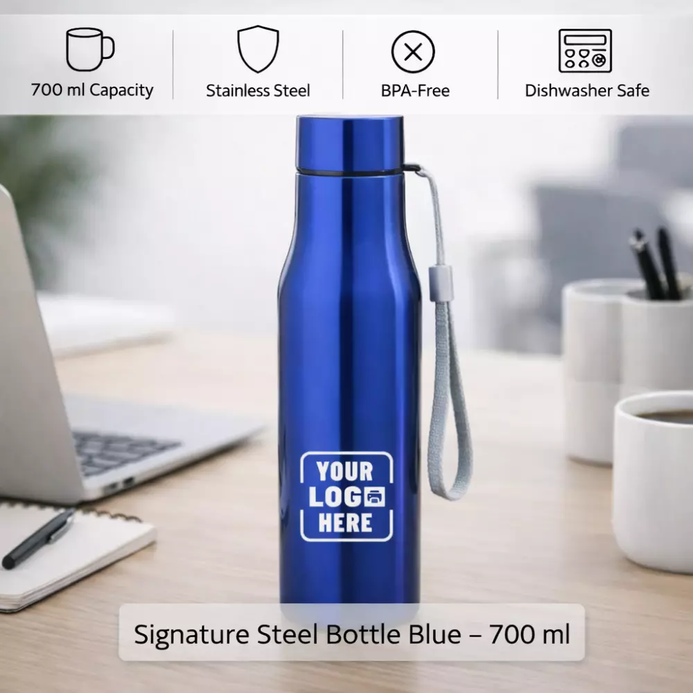 The Signature Steel Bottle Blue – 700 ml is designed to support consistent hydration throughout long workdays. Its higher capacity reduces the need for frequent refills, making it ideal for office hours, meetings, training sessions, and daily commutes. The blue finish adds subtle visual distinction while maintaining a professional and balanced appearance suitable for corporate distribution.