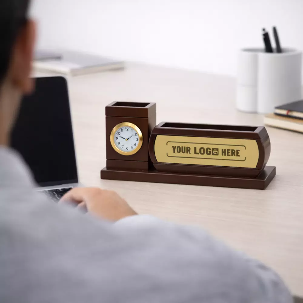 This desk organizer features multiple utility sections, including a pen holder compartment and a central display area suitable for branding or name plates. The integrated analog clock is positioned prominently, allowing easy time visibility without occupying additional desk space. The wooden base provides stability and maintains a clean, structured appearance.