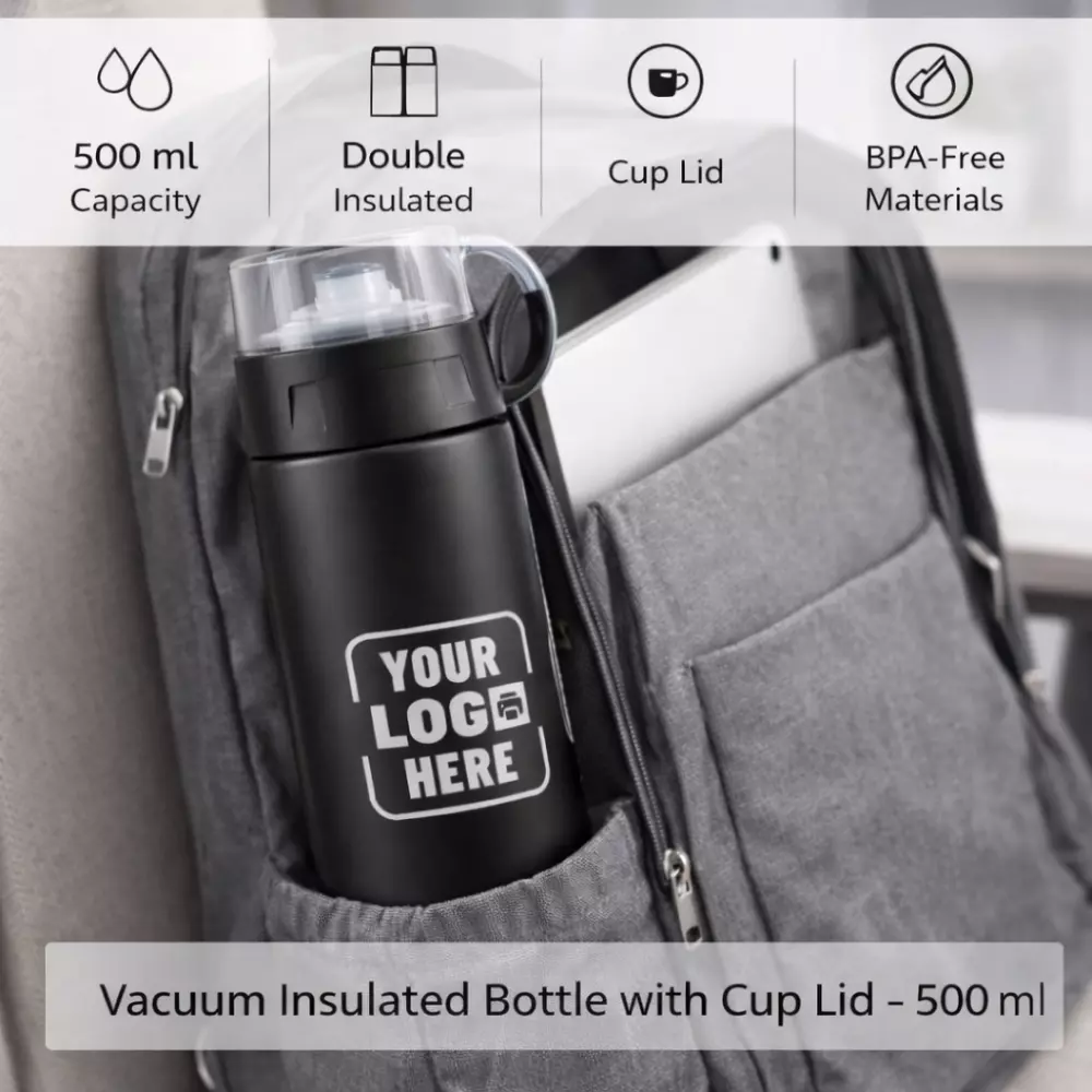 The Vacuum Insulated Bottle with Cup Lid – 500 ml offers excellent potential for corporate branding. The smooth stainless steel surface provides ample space for logo printing or laser engraving, ensuring clear and long-lasting brand visibility.